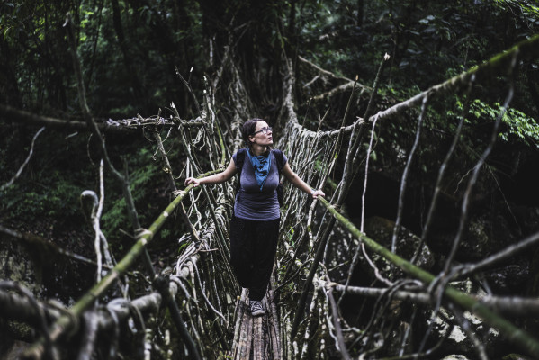 Nach zwei Tagen in Shillong fahren wir weiter in den Süden, nach Cherrapunjee, einer der regenreichsten Orte der Welt. Cherrapunjee, oder auch Sohra genannt, liegt auf einem Plateau auf 1.400m und von hier blickt man runter auf das Flachland von Bangladesch. Das ist auch der Grund für den starken Niederschlag. Das eigentliche Ziel unseres Aufenthalts hier sind aber die berühmten Root Bridges weiter unten im Tal. Seit Jahrhunderten nutzen die Khasi-Stämme die Wurzeln der Bäume um sie zu Brücken zu formen. Der Prozess kann 10-15 Jahre dauern aber einmal fertig, halten sie bis zu 600 Jahre. Wir beschließen ein paar Tage unten im Tal zu bleiben denn wir haben von anderen Reisenden erfahren, dass es dort wunderschön ist und es riesengroße Schmetterlinge gibt. Den Zusatz mit den riesengroßen Kakerlaken verdränge ich an dieser Stelle. Den Großteil unseres Gepäcks können wir in Cherrapunjee lassen und so machen wir uns auf einen schweißtreibenden Marsch tief nach unten in den Dschungel.