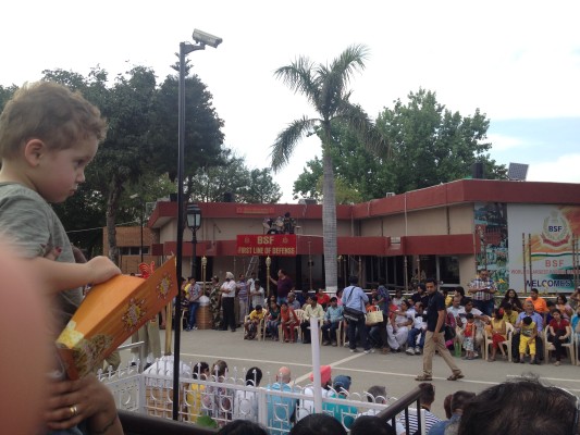 Danach aber weiter in Richtung der Grenze. Die letzten 2 km müssen zu Fuß zurückgelegt werden und bereits hier hat man das Gefühl, man wäre bei einem Fußballspiel. Indisches Fähnchen? Flagge im Gesicht? Hier ist alles möglich. An der Grenze angekommen haben die Touristen ihre eigene Tribüne und schon kann es losgehen. Angefangen wird bei diesem kleinen Schauspiel mit dem letzten Bus, der in Richtung Pakistan über die Grenze fährt, begleitet von der johlenden Menge. Dann gibt es laute Bollywood-Musik (auf der anderen Seite der Grenze läuft die pakistanische Variante), durch einen Animateur angeheizte „Hindustan“ Rufe und es wird getanzt. Wer will kann Popcorn und Cola kaufen und dann warten alle gespannt auf das Einholen der Fahnen. Es wird marschiert, gestapft, mit den Toren geklappert und gedroht, bis die Grenze endlich zu ist. Die Indischen Soldaten tragen eine Uniform die nur für spezielle Anlässe verwendet wird und das Ganze hat schon einen leichten Anflug von Slapstick-Komödie. Angeblich ist diese Zeremonie von beiden Seiten der Grenzpolizisten ausgearbeitet, d.h. es ist meines Erachtens eher ein großes Schauspiel als alles andere aber mit dem Konflikt im Hintergrund und den Scharfschützen auf den Dächern ist eine gewisse Ernsthaftigkeit nicht auszuschließen. Da Bilder bekanntlich mehr als tausend Worte sagen, hab ich auch ein paar Videos gedreht um das Ganze zu verdeutlichen.