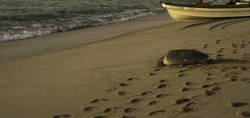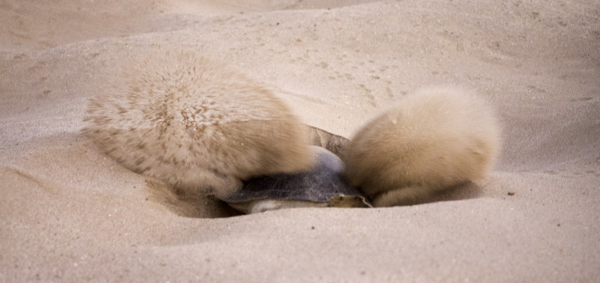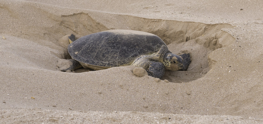In dieser Nacht haben wir Glück und finden eine Schildkröte die gerade dabei ist ihre abgelegten Eier im Sand zu verstecken. Oftmals schaufeln die Tiere mehrere Kuhlen um einen für sie sicheren Platz zu finden. Nicht nur das schaufeln, sondern auch das Eierlegen ist sehr anstrengend und kann mehrere Stunden dauern. Man kann wirklich sehen wieviel Kraft das Tier aufwenden muss, um mit den Vorderflossen den Sand nach hinten zu schleudern. Immer wieder muss Sie pausen machen bis sie kurz nach Sonnenaufgang fertig ist und langsam ihren Weg zurück ins Meer sucht.